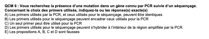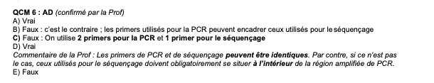 Commentaire de la Prof : Les primers de PCR et de séquençage peuvent être identiques. Par contre, si ce n’est pas le cas, ceux utilisés pour le séquençage doivent obligatoirement se situer à l’intérieur de la région amplifiée de PCR. E) Faux