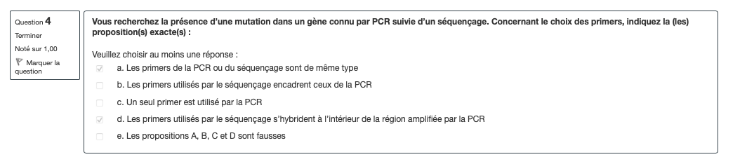 Alors j'ai peut être mal formulé l'item. Je l'ai mis faux pour insister sur le fait qu'on utilise qu'un seul et unique primer pour le séquençage