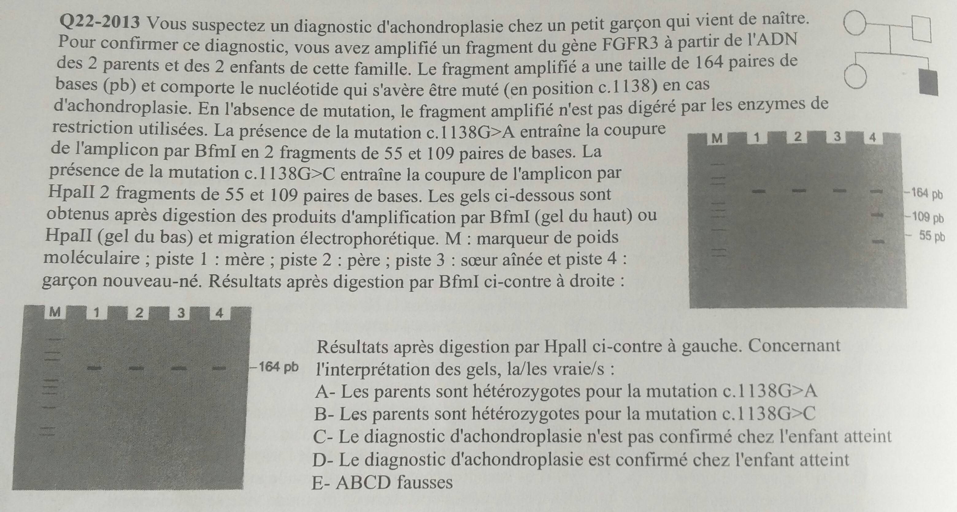 La correction officieuse de ce qcm nous dit qu'on peut confirmer le diagnostique d'achondroplasie pour l'enfant atteint. Comme ça j'aurais dit qu'on ne pouvait pas avec juste une migration électrophorétique et qu'il fallait aussi faire un séquençage pour confirmer le diagnostique, du coup ça me fout le doute :sweat: