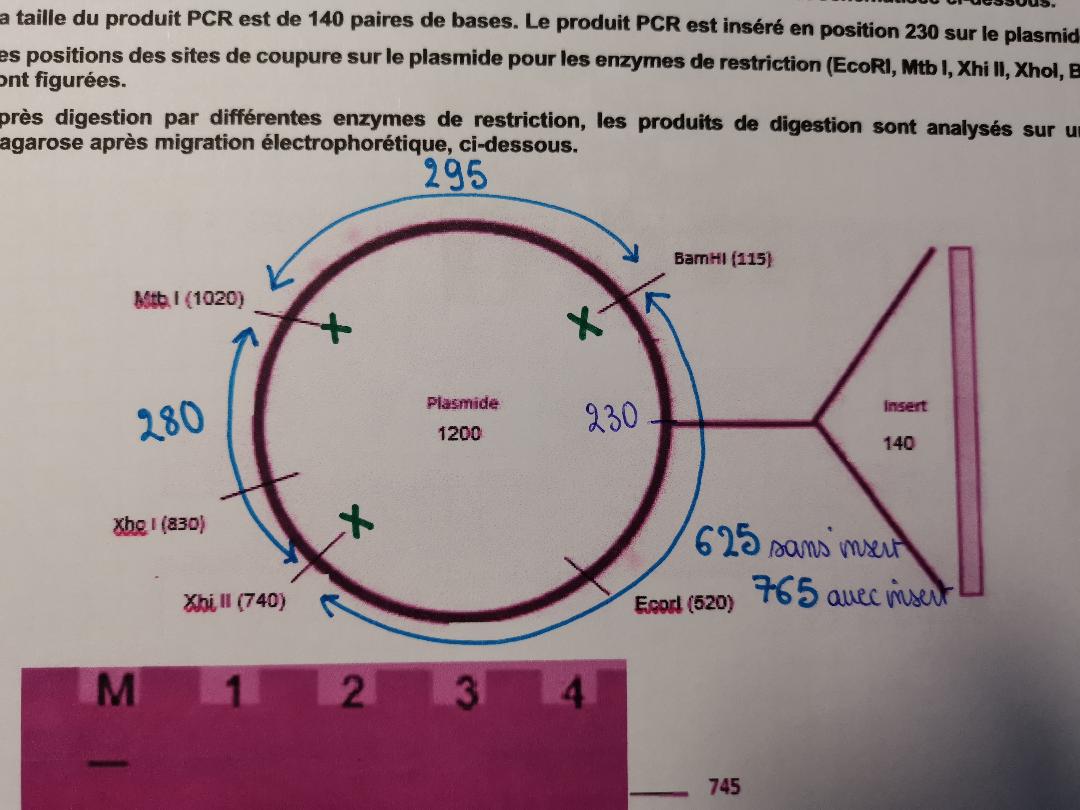 Or sur ton électrophorèse tu as 3 bandes (donc ça c'est bon) mais pas à la bonne taille c'est à dire une bande à 295pb (ok), une à 280 (ok) et 745 (pas ok) qui démontrerait la présence d'un insert de 120pb et pas 140 dans l'énoncé
