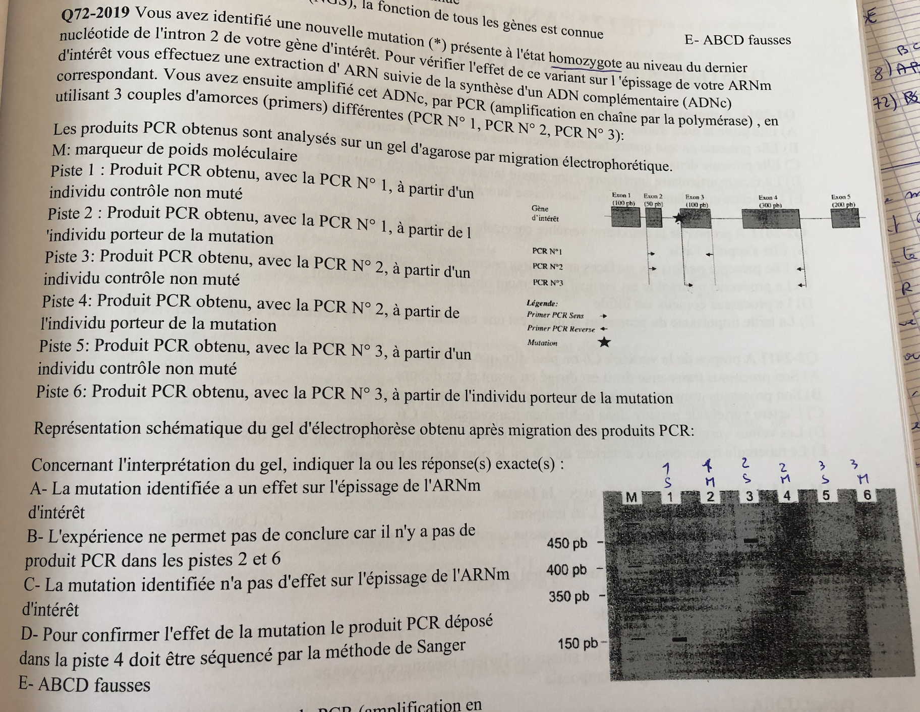 . Autant pour la piste 6 l'absence de la bande peut être du au variant d'épissage donc on ne verra pas l'exon 3 et tout ce qui suit, mais pour la piste 2 je ne comprends pas pourquoi on ne voit pas l'exon2 qui ne devrait pas être touché par la mutation