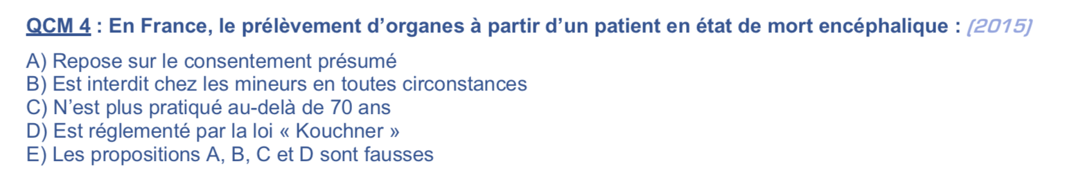 "le prélèvement d'organes à partir d'un patient en ME .... B) est interdit chez les mineurs en toute circonstances"