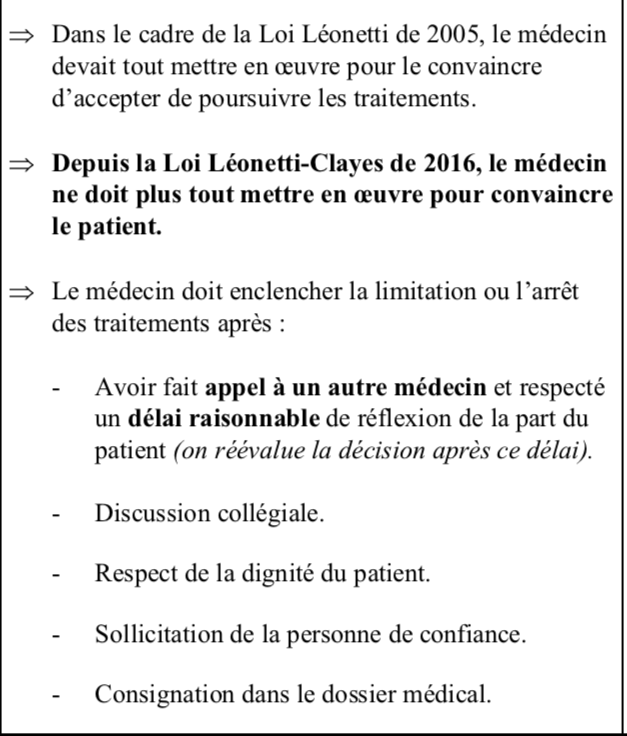 En fait, suite au QCM 9 du DM, j'avais retenu que en 2005, le médecin devait tout mettre en œuvre pour convaincre le patient à continuer les soins. Ce n’est plus le cas en 2016 ! Attention aux différences entre les lois Léonetti (patient non en fin de vie, conscient) et Léonetti Claeys.