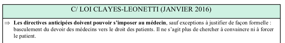 Donc pour répondre à ta question : tu as tout à fait compris. Pour la loi de 2005, on considère que les directives anticipées sont un éclairage MAIS pour celle de 2016 on ne considère plus qu’il s’agit d’un simple éclairage car elles sont devenues vraiment contraignantes/ incitatives +++ pour le médecin.