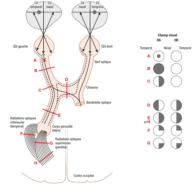 -> une lésion du tractus optique droit donnera une hémianopsie latérale homonyme gauche = perte des hémi-champs visuels gauches