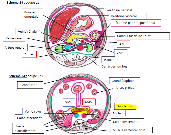 Donc astuce pour savoir ce qui est intra/rétropéritonéal = bien regarder où se place le péritoine pariétal postérieur. Sur le dernier schéma tu vois que le D3 est rétropéritonéal car le péritoine pariétal postérieur lui passe devant et pas derrière. En revanche les côlons sont bien intra-péritonéaux car ils ont du péritoine devant et derrière eux.