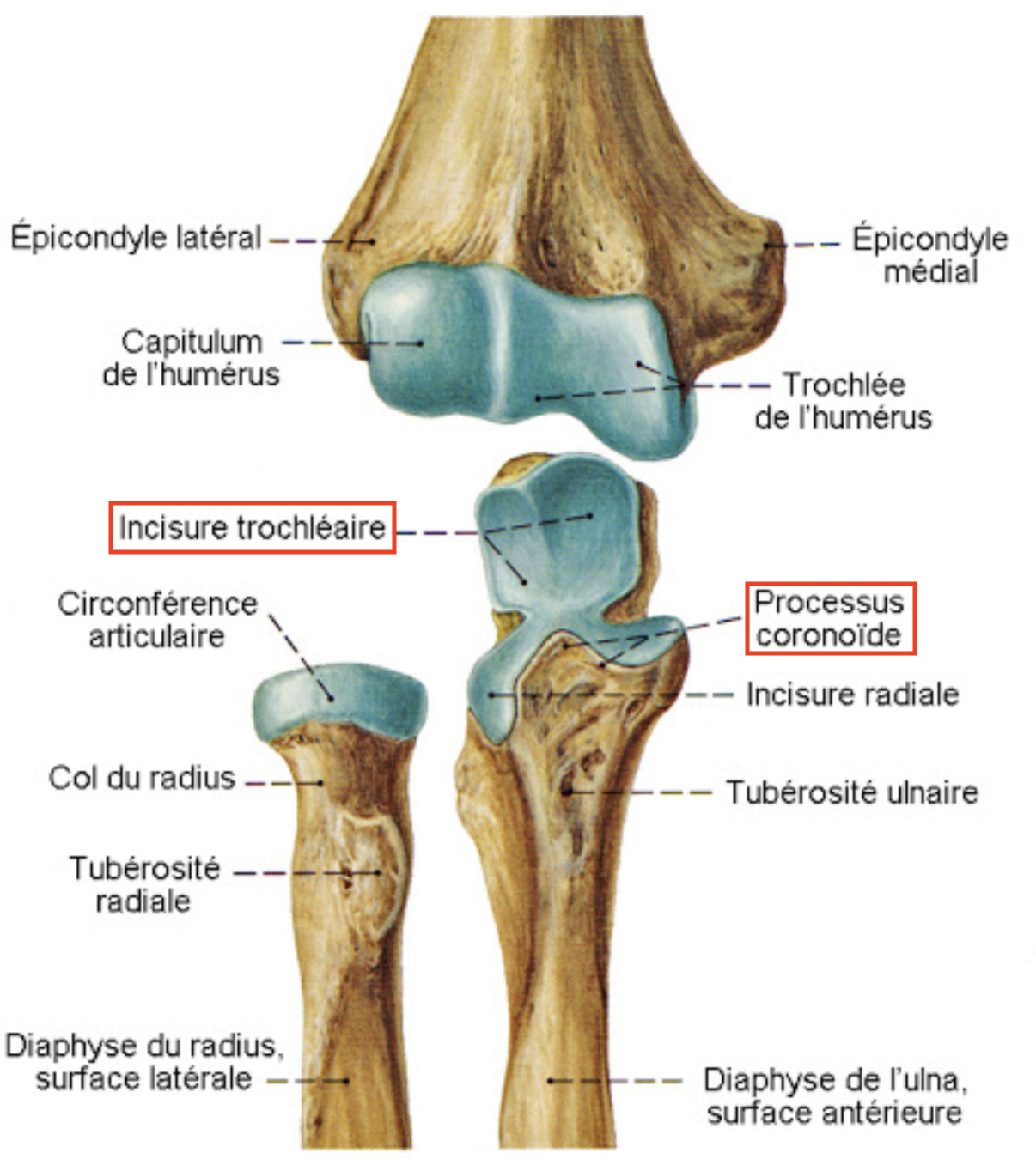 Ensuite, le prof ne fait pas la différence entre processus, apophysaire, tubercule, du coup tu peux considérer que tous ces termes sont synonymes : apophysaire coronoïde = processus coronoïde, apophyse olécranienne = processus olécranien = olécrane.