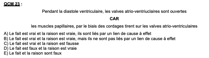 J'ai une question par rapport à ce QCM car j'avais compris que les muscles papillaires servaient à fermer les valves en tirant sur les cordages (en systole) et que c'était la pression qui ouvrait les valves.
