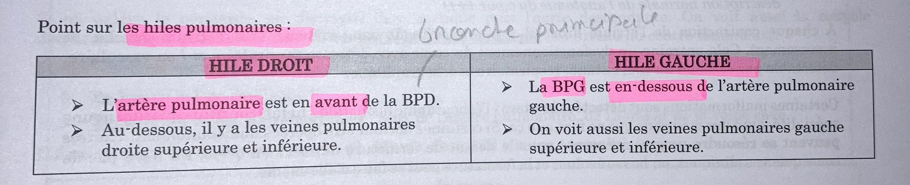 Le qcm 7 nous dit que dans le hile pulmonaire gauche l’artère est en avant et au dessus de la BPG mais dans le cours on nous dit qu’elle est au dessus... (roneo 3 p14)