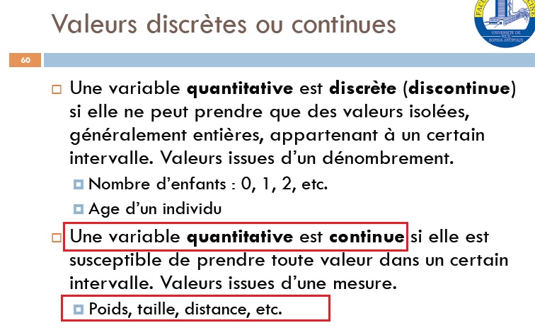 Pour ce qui est du poids c'est une variable quantitative continue car même si je dis que mon voisin fais 70kg j'arrondie donc je perd de l'information donc on dit que le poids est dans un intervalle de poids car pour trouver quelqu'un qui fais exactement 70kg et pas 70,00000234kg c'est impossible donc pour être sur de pas se tromper je dirais que mon voisin a un poids entre 70kg et 71kg
