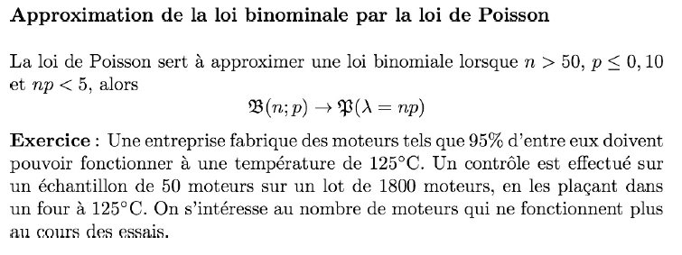a) approximation de la loi binomiale par la loi normale : une loi binomiale B (n,p) peut être approximer par une loi normale N (np = μ , √'(npq)= σ )