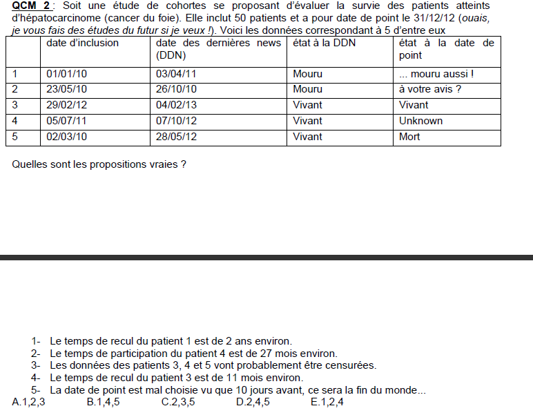 QCM 2 : Soit une étude de cohortes se proposant d’évaluer la survie des patients atteints