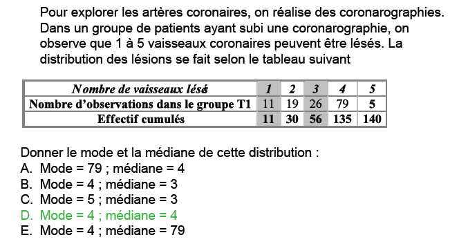 La médiane correspond au nombre de vaisseaux lésés ( la variable étudiée) en dessous duquel 50% de l'effectif se trouve (dans le cas présent 50% de 140 = 70 personnes, donc la médiane correspond à la valeur comprenant la 70e personne (en schématisant). Médiane = 4 ici ( l'effectif cumulé est de 135 personnes pour un nombre de 4 vaisseaux lésés, alors que pour 3 vaisseaux lésés l'effectif cumulé est de 56 < 70, donc la médiane ne peut être que " 4 vaisseaux lésés").