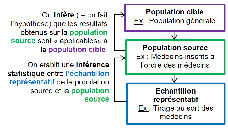 Pour des raisons pratiques j'imagine, lorsque l'on doit faire une étude étiologique (ou clinique) portant sur une population de personnes (population cible), plutôt que de prélever un échantillon de ces personnes parmi l'ensemble d'entre elles (trop compliqué de répertorier de façon exhaustive toutes les personnes concernées), on constituera l'échantillon à partir d'un sous ensemble plus réduit (et donc plus accessible ) de ces personnes.