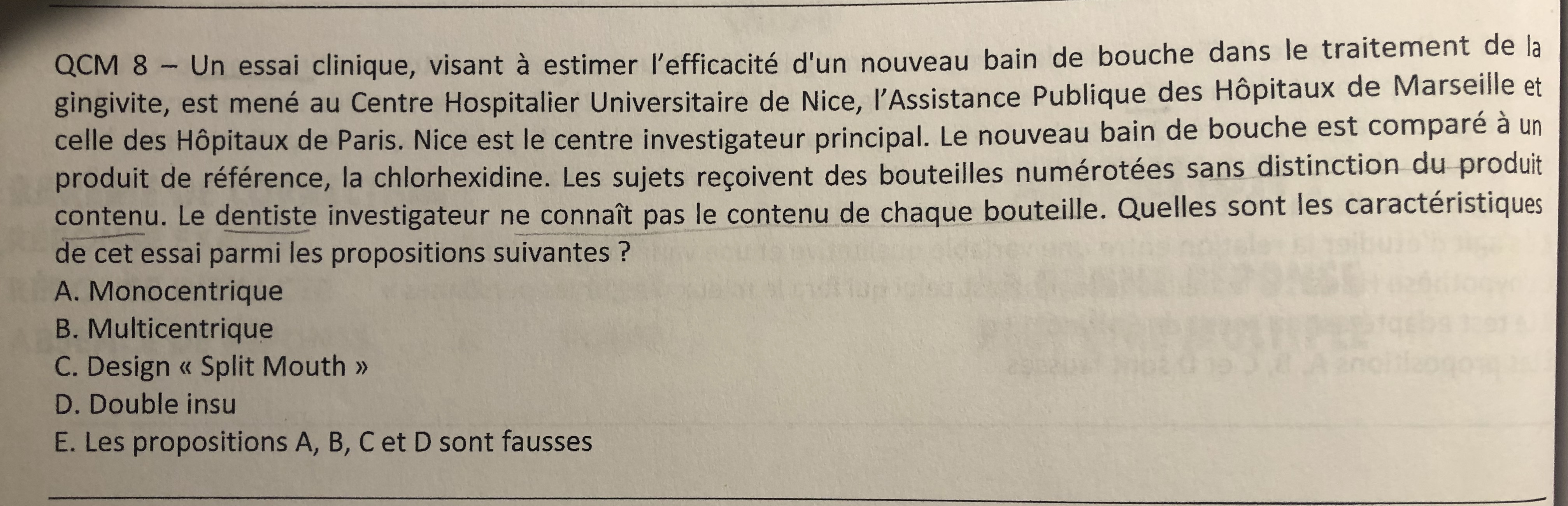 Dans l'exemple du QCM, la méthode de déroulement de l'étude n'est pas clairement expliquée mais l'on peut se douter qu'il est très difficile de tester distinctement 2 bains de bouches différents et en même temps sur une seule personne. Voilà pourquoi on peut éliminer le design "spli-mouth".