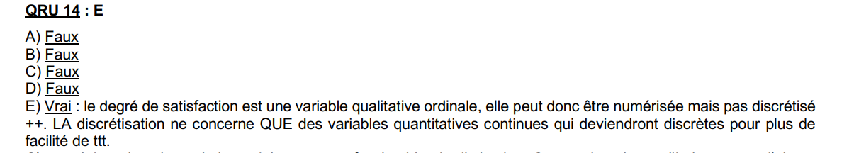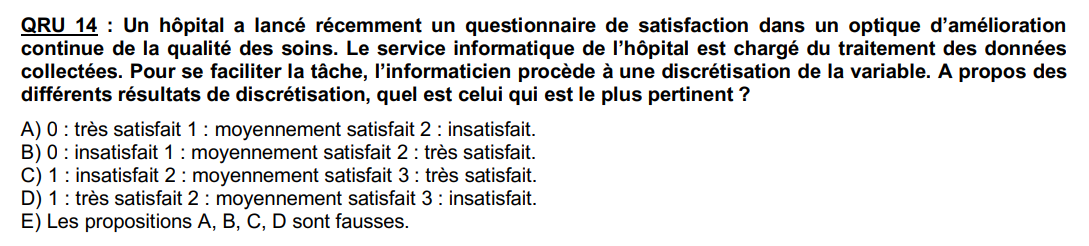 discrétiser une variable qualitative ordinale (le degré de satisfaction), ce qui n'est PAS POSSIBLE. D'où le fait qu'on choisisse la réponse E.