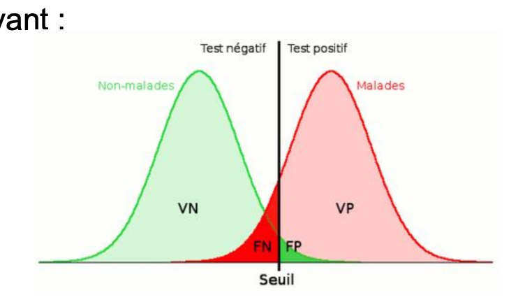 Cette partie du cours signifie simplement que lorsqu'on est en présence d'un test quantitatif (ex: mesure de la charge virale dans un prélèvement), on introduit une valeur seuil qui permettra de définir seulement 2 cas de figure possibles : positif au test ou négatif au test.