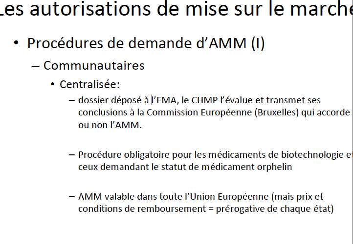 Pour ce qui est du CHMP qui fait passer ses conclusions à l'EMA, c'est vrai que c'est bizarrement dit, mais moi j'imagine plus le truc comme tout pleins de comités différents au sein de l'EMA qui après donnent leur avis à l'ensemble de l'EMA, qui propose ou non l'AMM (validée ou non par la commission européenne)