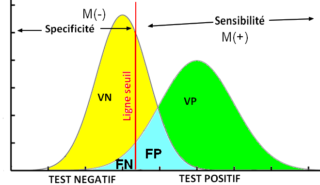 La partie bleu correspond d'une part ( a gauche quand le test est negatif ) au FN et d'autre part ( a droite quand le test est positif) au FP.