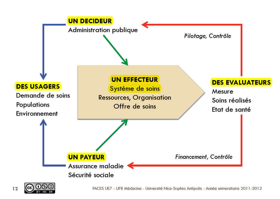 Les évaluateurs : ce sont les organismes chargés de vérifier le bon fonctionnement du système de soins et de santé, ils réalisent des études et notifient les problèmes, proposent des solutions et imposent parfois à certaines structures de changer certains aspects de leur mode de fonctionnement pour une meilleure efficacité (cet aspect sera revu dans le cours sur l'évaluation en médecine)