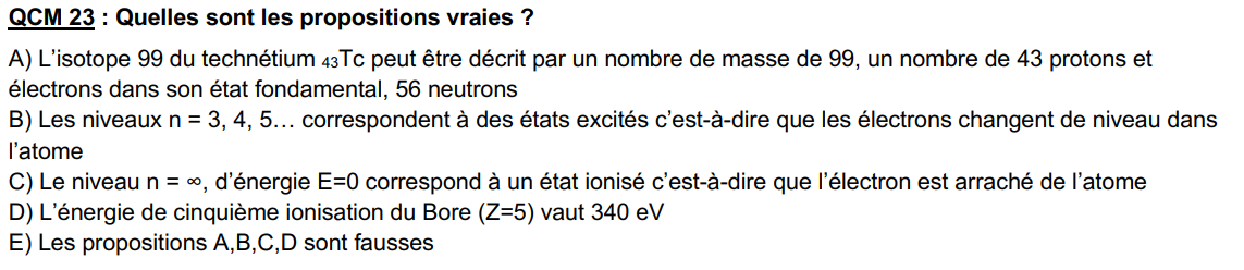 :arrow: concernant l'iem C, je trouve la formulation un peu ambigu mais on cherche juste à montrer ce qu'est un électron ionisé. L'électron qui a donc été éjecté de l'atome se retrouve donc hors de l'atome (on matérialise ça par l'infini) et donc tend vers une énergie nulle (vu que plus on augmente dans les couches de l'atome plus l'énergie se rapproche de 0)