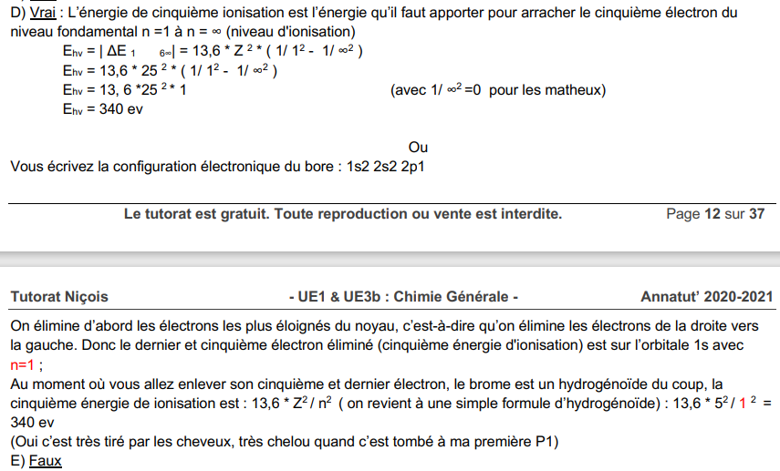 :arrow: concernant l'iem D, en fait on réalise tout d'abord les ionisation électron par électron (donc on les arrache un par un de l'atome) hors on sait que lorsque que l'on ionise les électrons on va les enlever de la couche la plus externe à celle la plus interne donc étant donné que le Bore possède 5 électrons la cinquième ionisation correspondra à la couche la plus interne donc à n=1 qui est calculable grâce à la formule de l'hydrogenoïde que l'on connaît ! :terror: