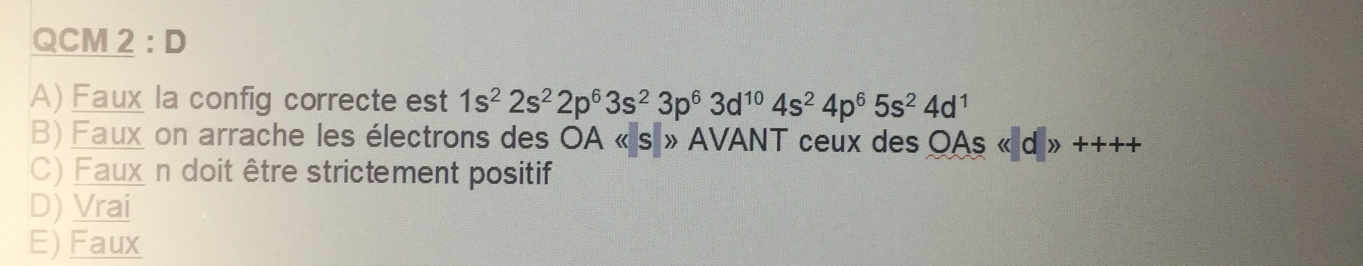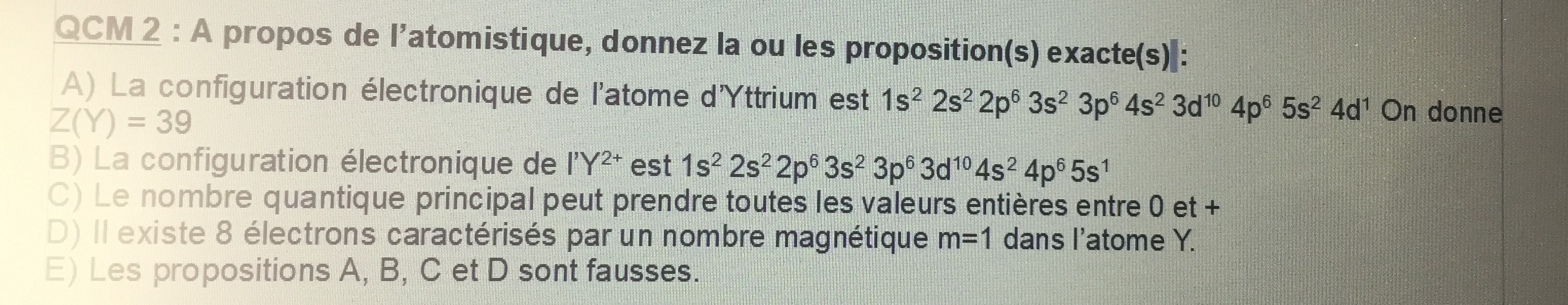 J'ai du mal a comprend la correction de l'item B. Pourquoi ne peut on pas partir du principe que Z(Y)= 37 et refaire la configuration électronique ? ( quand je fais ca je trouve la configuration de l'item B mais qui est fausse du coup )