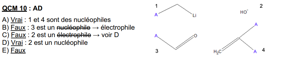 J'en profite pour rappeler que pour déterminer la nucléophilie ou l'électrophilie d'une molécule, on regarde toujours par rapport à l'atome de Carbone ! C'est pour cela que pour la molécule 3, même si l'O est chargé en électrons, la molécule est bien électrophile car le C est appauvri en électrons.