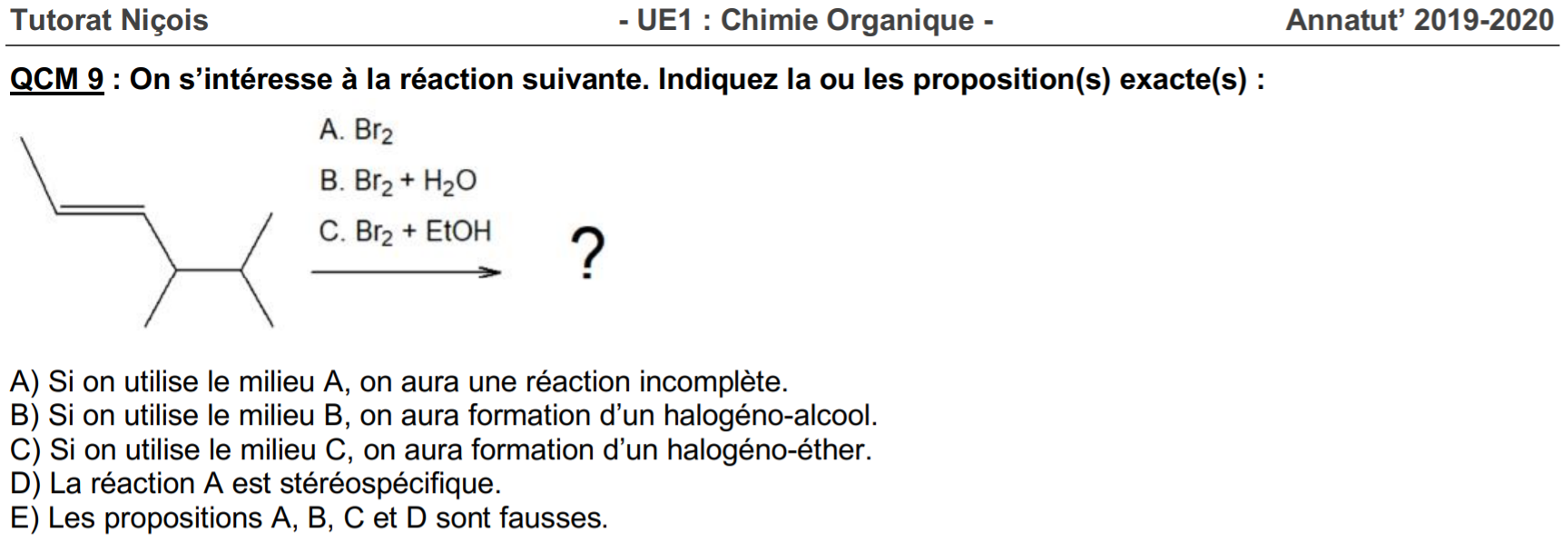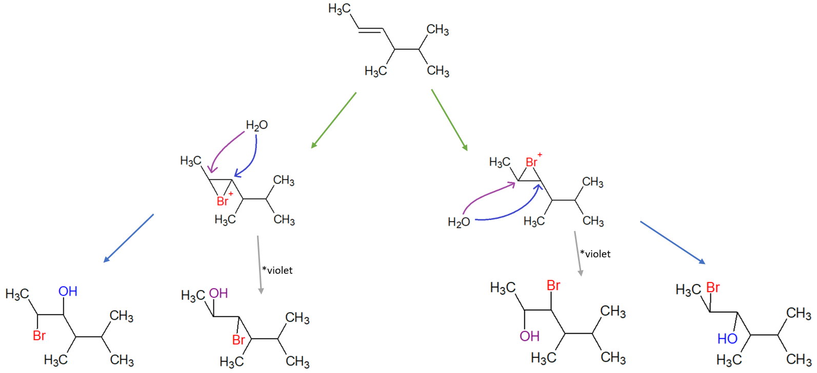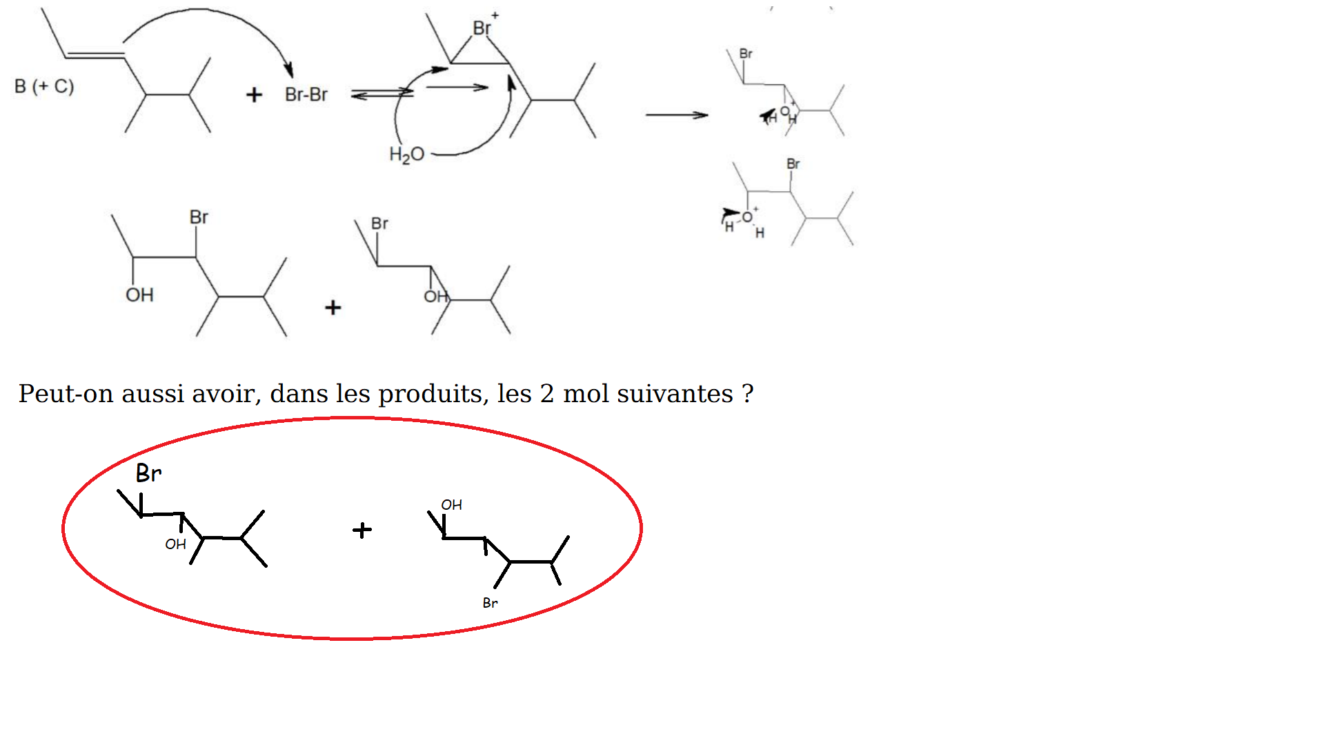 Donc au final on obtient juste le produit bleu et le produit violet quoi. Et n'oublie pas que le Br et le OH ne pourront jamais être sur le même carbone car c'est une trans-addition ++