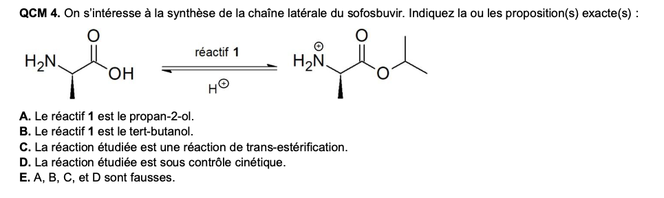 C'est pas juste une estérification tout court ? comme on a un acide carboxylique + un acide en tant que catalyseur et si l'item A est juste on a un alcool du coup tout ce qui est nécessaire a une estérification ? Et si c'est une estérification c'est sous contrôle thermodynamique ?