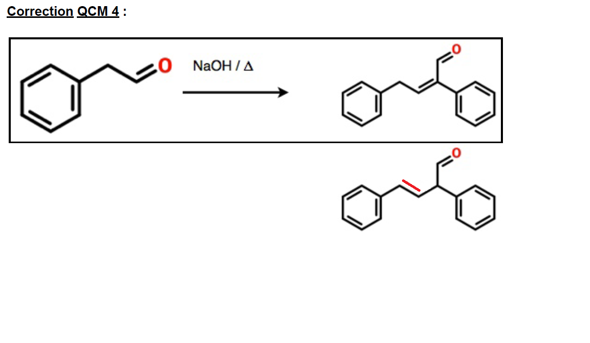 Il s'agit dans l'exo 4 d'une crotonisation, la double liaison se place entre l'alpha et le béta (ou tu as éliminé l'alcool de l'aldol), on obtient un carbonyl alpha-béta insaturé. Tu conserves ainsi la mésomérie céto-énolique (enfin énolate-aldéhyde)