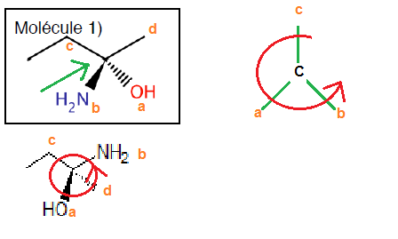 Se placer dans l'axe C-d, cela veut dire que tu as les 3 groupements prioritaires dans un même plan avec le carbone au centre, ET que l'élément minoritaire d se retrouve derrière le carbone, caché par le carbone.
