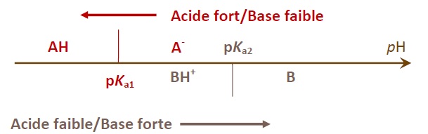 Plus la base d'un couple acide/base est stabilisée, plus son domaine de prédominance est étendu, plus la base est faible et l'acide est fort.