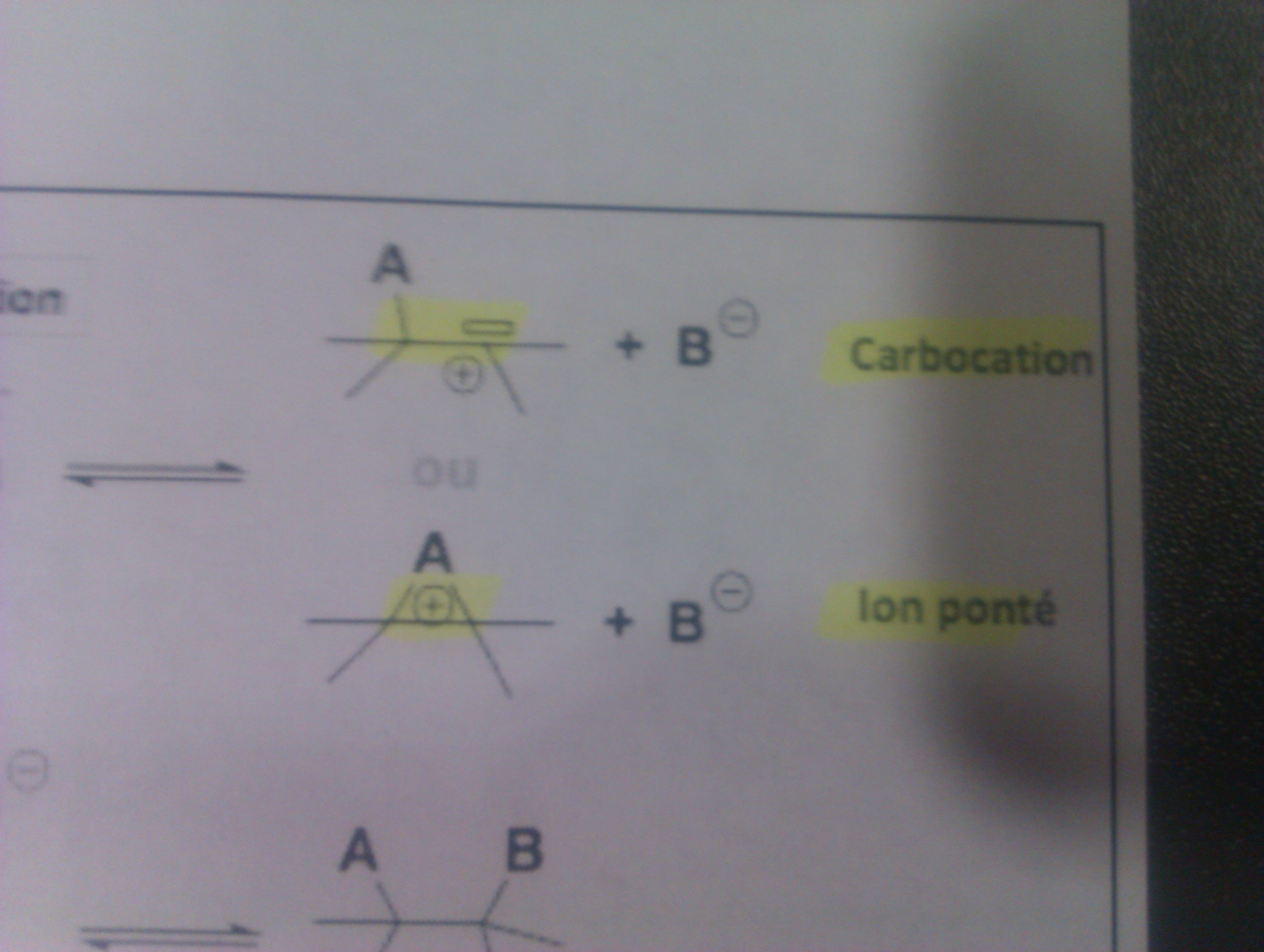 Dans le cas de H+ c'est un petit bonhomme qui quand il casse la double liaison eh bah il lui manque un bras ( un électron ) et donc il peut pas prendre l'autre bout de corde donc il la prend complétement la corde pour bien s'attacher au poteau ( le carbone ) mais l'autre n'a plus de corde (formation du carbocation ) .