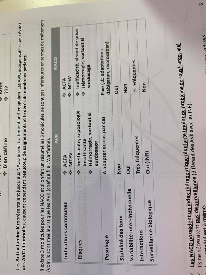 Alors je ne sais pas d'où sort le tableau de la ronéo, mais j'avais fais ma fiche avec le cours audio et le diapo du professeur dans sa mise à jour 2020 pour les pass/las, donc j'aurais tendance à dire de retenir le premier. Ca me paraîtrait d'ailleurs étrange qu'un anti coagulant puissant n'ait pas de surveillance.