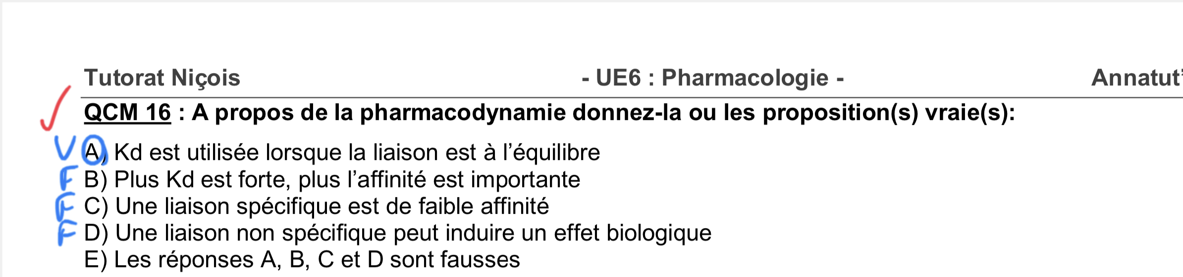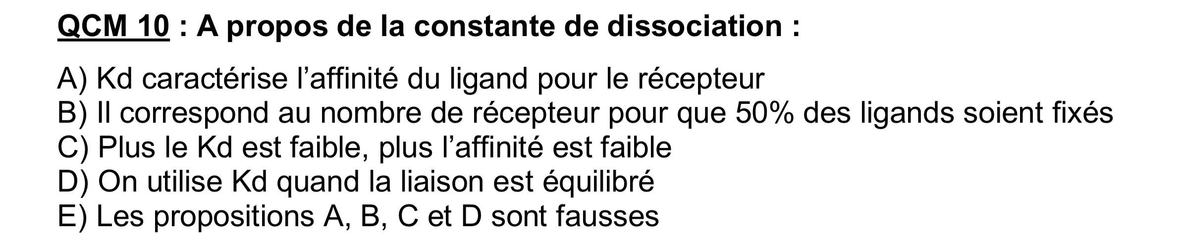 Alors j'ai parcouru la ronéo et j'ai trouvé un truc : on dit que la liaison du médicament au récepteur est réversible et de ce fait atteint un certain niveau d'équilibre, et une fois arrivé à cet équilibre on aura la courbe qui permet de calculer KD (ronéo 5 p 17), c'est pour ça qu'ils sont comptés justes :embarrassed: