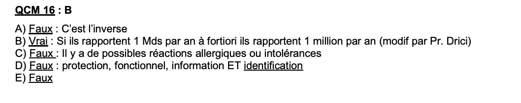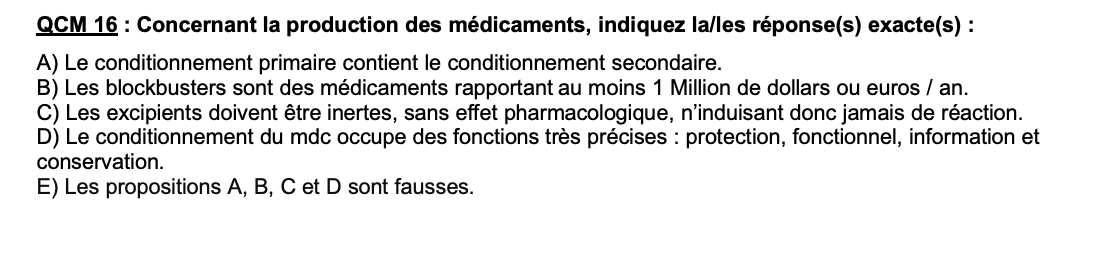 J'en étais suuuure pour ce qcm mdr.. Je l'ai compté vrai parce que pour que le médicament soit considéré comme un blockbuster, il doit certes posséder un chiffre d’affaires supérieur à 1 milliard de dollars.