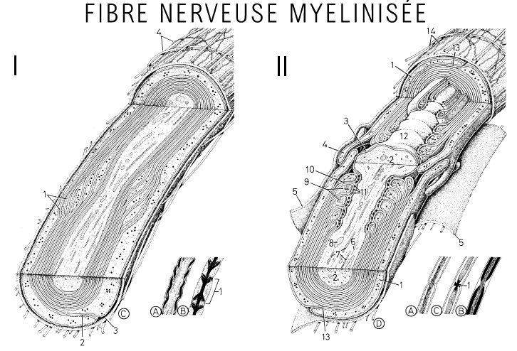 Cette gaine de myéline est un ensemble de lamelles superposées les unes sur les autres. Dans la structure finale, avec une coupe transversale (je confond toujours les types de coupes désolé si c'est pas ça), tu trouves ton axone au centre recouvert par cet enroulement myélique qui assure les 4 "avantages".