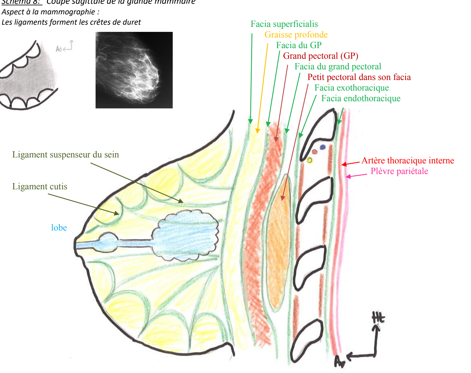 prolongation des ligaments suspenseurs au niveau de la peau qui donne cet aspect un peu dentelé sur le schéma, leur rôle est de solidariser la glande mammaire à la peau