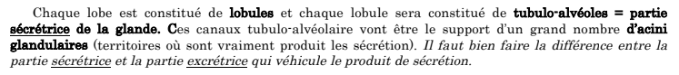 Par contre ceux sont bien les acini qui sont l'unité de production du lait car on distingue la partie sécrétrice et la partie excrétrice qui elle, va véhiculer le produit de sécrétion. Or, on dit bien que l'acinus est l'unité de PRODUCTION du lait, alors que les tubulo-alvéoles composent la partie SÉCRÉTRICE.