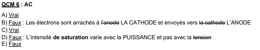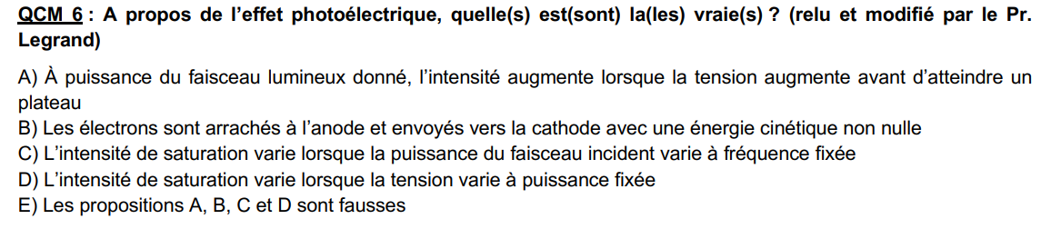Pour l'item A, comme on précise "à puissance du faisceau lumineux donnée" on va se focaliser sur une seule des 3 courbes du graphique (peu importe laquelle). En effet, on voit que les 3 courbes, qui représentent les variations de l'intensité, ont globalement la même allure, c'est à dire qu'elles augmentent quand la tension augmente. La seule chose qui varie entre ces 3 courbes est l'intensité maximale, qu'on appelle intensité de saturation, qu'elles vont atteindre. Cette intensité de saturation n'est pas la même selon la puissance du faisceau.