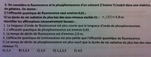 4 : F la fluorescence, c'est de la luminescence... (à chaud, je trouve l'item un peu tordu, mais vu que je vois pas vraiment comment on peut dire vrai, j'aurais mis faux de toute façon...)