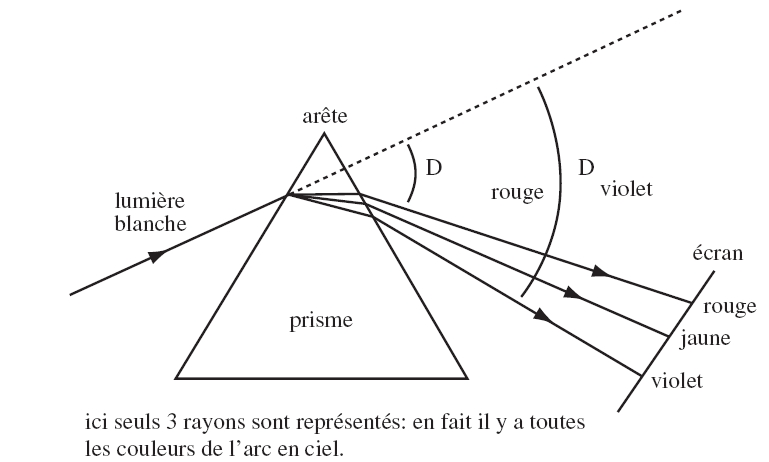 Donc sur ce schéma, tu vois bien que le violet est plus dévié que le rouge. C'est à cause de leur longueurs d'onde, en effet la longueur d'onde du violet est inférieure à celle du rouge donc il sera plus dévié à cause de la loi de Cauchy.