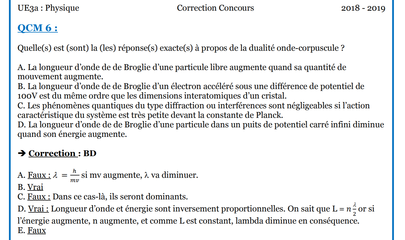 -9 m, comme la longueur d'onde d'un électron sous une ddp de 100 V donc l'item est bien juste, mais je suis d'accord avec toi, ce n'est pas indiqué dans le cours