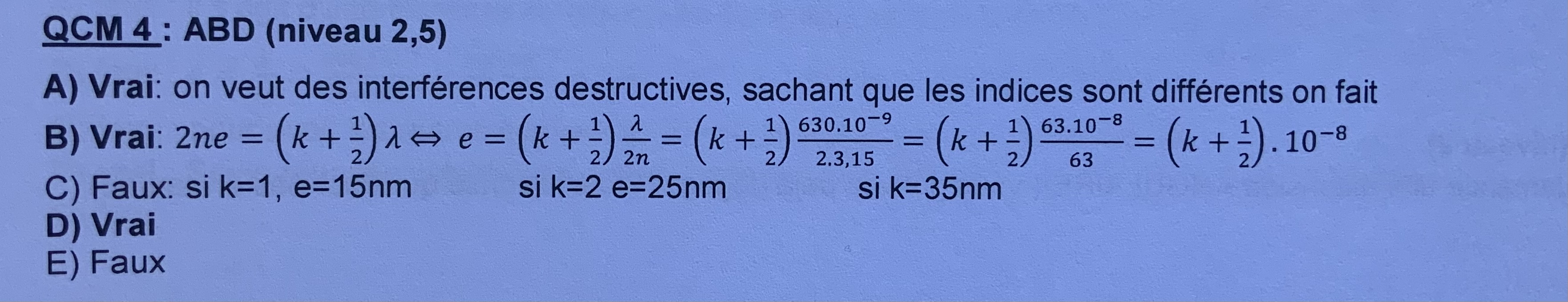 Il me semble que la correction de ce QCM est fausse, perso je trouve 10^-7 et pas 10^-8 comme dans la correction. Mais meme si c’est moi qui est mal calculé les items avec 10^-8 les items A et C sont faux car ils sont en nm et pas en μm