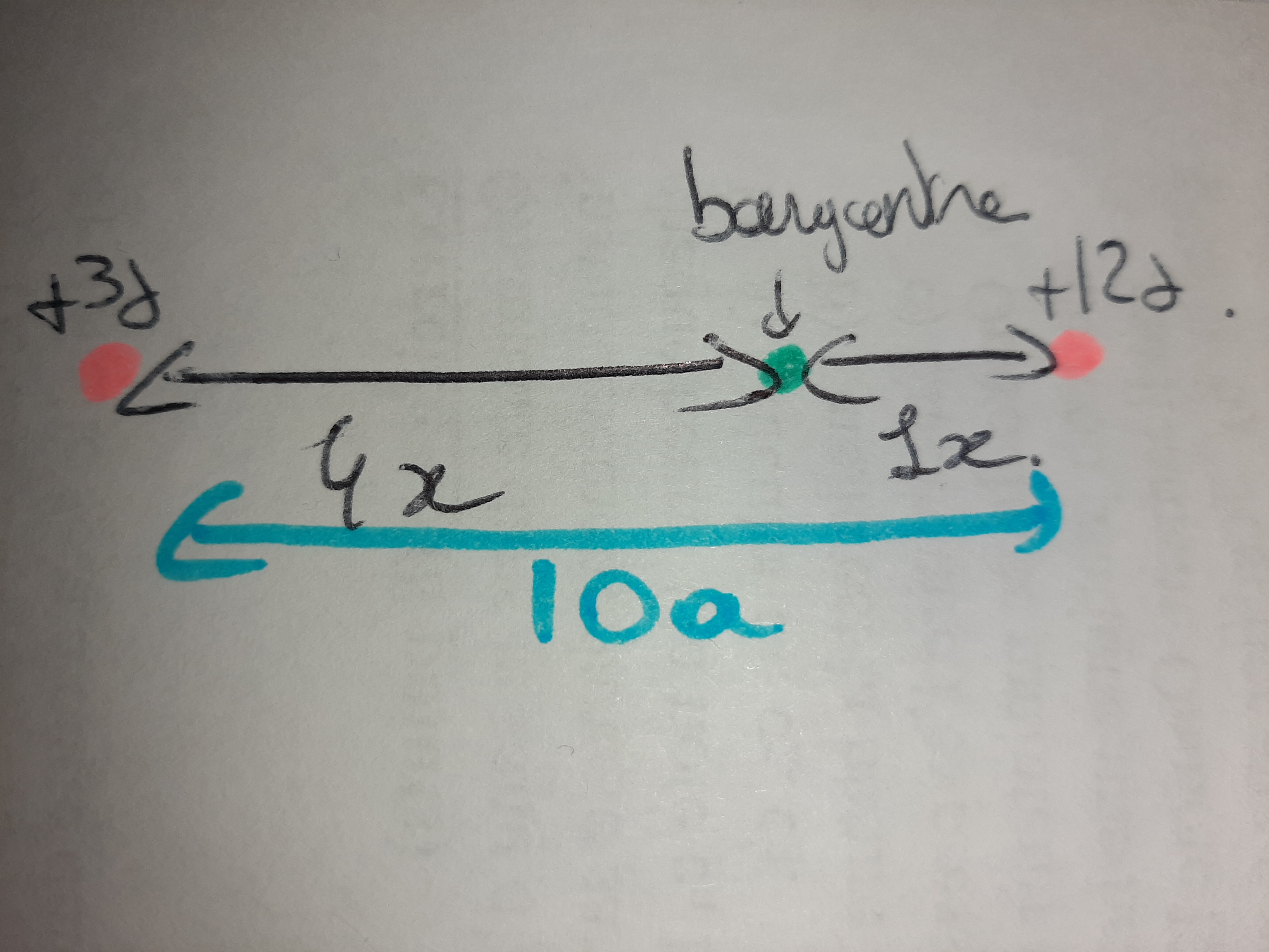 Ainsi entre le barycentre et la charge on a 2a car 1x=2a et entre le barycentre et la charge de gauche on a 8a car 4x=4*2a=8a