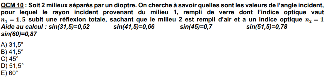 Pour ta première question, pour avoir une réflexion totale il faut que l'angle incident soit supérieur