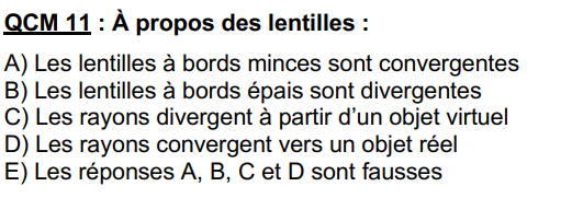 Pour ta 2ème question, effectivement les lentilles à bords minces sont convergentes et les lentilles à bords épais sont divergentes mais c'est bien ce qui marqué dans ce QCM dans les items A et B donc je ne comprends ce qui te dérange ?