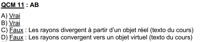 Et par rapport à la correction des items C et D, ce sont des phrases tirées telles quelles du cours. En fait cette notion vient du fait que les rayons proviennent de la gauche et vont vers la droite. Donc les rayons partent d'un objet qui est à gauche de la lentille et divergent vers la lentille. Quand ils traversent la lentille, il sont déviés de manière à converger tous vers un seul point qui est l'image. Quand le prof dit "les rayons convergent vers un objet virtuel" c'est juste une question de dénomination. En gros ça veut dire qu'ils convergent vers quelque chose qui est à droite de la lentille ; donc si c'est un objet il est virtuel mais si c'est une image elle est réelle.