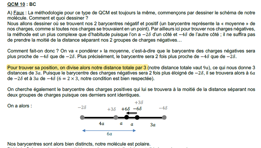 Ayant comme valeurs de moment dipolaire négatifs: -2δ et -4δ je pensais qu'il fallait résoudre 2x + 4x =9 et donc avoir 6x=9 donc x=1.5 pour avoir la position du barycentre des charges négatives.
